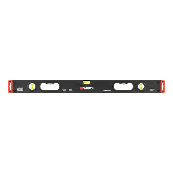 Reinforced light-metal spirit level with continuous profile and two handles, vertical vials can be viewed from different angles